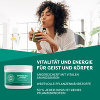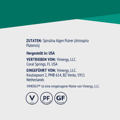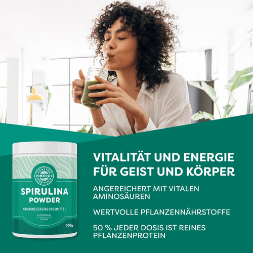 • Spirulina-Pulver-Ergänzung -Vimergy Spirulina-Pulver steckt voller lebenswichtiger Aminosäuren, wirkungsvoller Phytonährstoffe und 50 % jeder Portion bestehen aus reinem Pflanzenprotein!