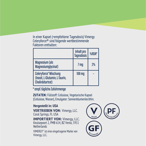 • Vimergy Celeryforce ist die perfekte unterstützende Mischung mit Inositol, L-Glutamin, L-Taurin, Cholin und Magnesiumglycinat.