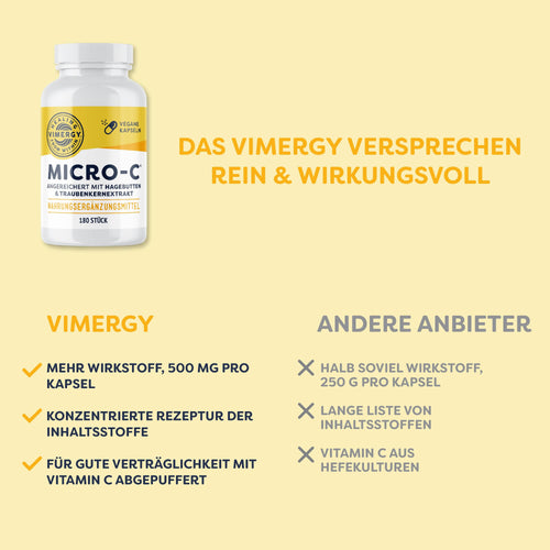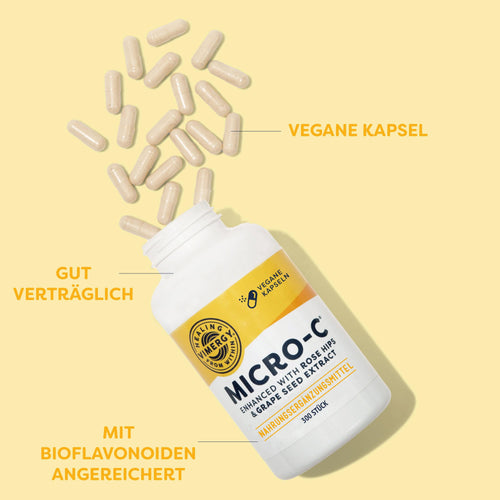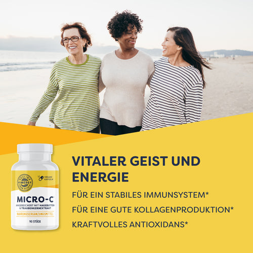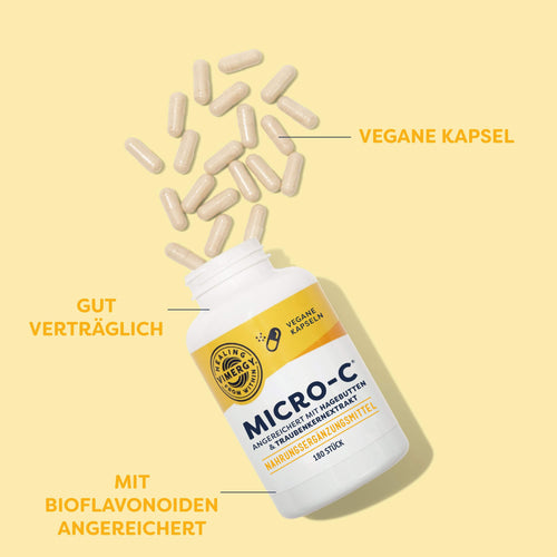 Vitamin C ist eine notwendige Komponente in der Synthese des strukturellen Proteins Kollagen, benötigt für gesunde Haare, Haut, Nägel, Gelenkgewebe und starke Knochen.