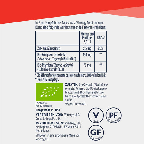 Vimergy Total Immune BlendTM kombiniert die bewährten Kräuter Spitzwegerich und Thymian mit kraftvollem flüssigem Zink, um das ganze Jahr über antioxidativen Immunabwehr zu bieten.