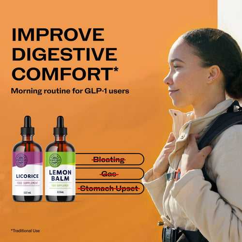 Lemon balm is used traditionally to relieve mild gastrointestinal complaints including bloating and flatulence; while licorice helps to soothe discomfort of the gastrointestinal tract, such as gastritis