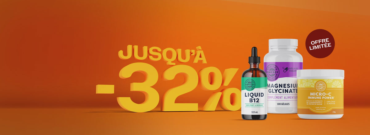 Offre valable du 20 novembre 2025 au 28 novembre 2025. Les clients bénéficieront d’une remise allant jusqu’à 20 % sur tous les produits éligibles au Mix + Save et de 15 % sur certains formats Refill & Value. Les clients qui dépensent 250 € ou plus recevront un Seasonal Immunity Kit gratuit (Soothe Wise* et 3 verres WellMix). Le Seasonal Immunity Kit est disponible en quantités limitées et sera ajouté automatiquement aux commandes éligibles, selon le principe du premier arrivé, premier servi. Les remises et le Seasonal Immunity Kit gratuit sont appliqués automatiquement lors du paiement. L’offre Mix + Save s’applique aux formats Full-Size (le pourcentage de réduction varie selon le nombre de produits Full-Size différents dans la commande). L’offre ne s’applique pas aux formats Travel, Refill ou Value, ni aux Kits. La remise Mix + Save peut être combinée avec l’offre Sign Up + Save – jusqu’à 36 % d’économies au total. Les remises ne peuvent pas être réparties entre plusieurs commandes. Offre valable uniquement sur vimergy.com, vimergy.co.uk et vimergy.eu. Non valable pour les commandes d’abonnement programmées. Offre non valable chez d’autres revendeurs de produits VIMERGY. Non applicable aux achats antérieurs. Aucun ajustement de prix. D’autres conditions peuvent s’appliquer. Offre valable dans la limite des stocks disponibles. Aucun bon de réservation ne sera émis.
