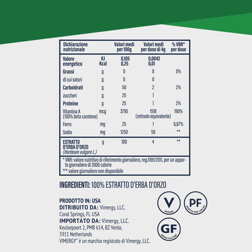 Il succo di erba d'orzo è prodotto da succo di erba d'orzo concentrato 21 volte rispetto all'erba d'orzo, il che lo rende una fonte altamente biodisponibile di nutrienti funzionali.