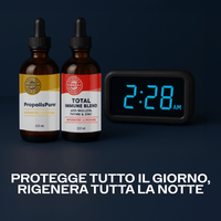 PropolisPure® di giorno. Total Immune Blend* di notte. Sollievo costante per la gola e sostegno continuo per il sistema immunitario.