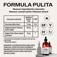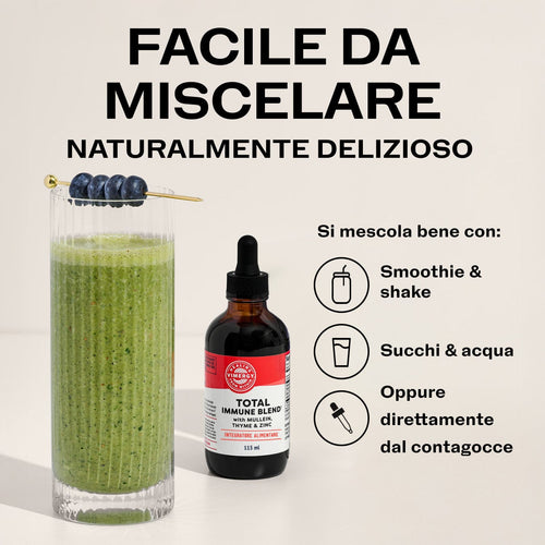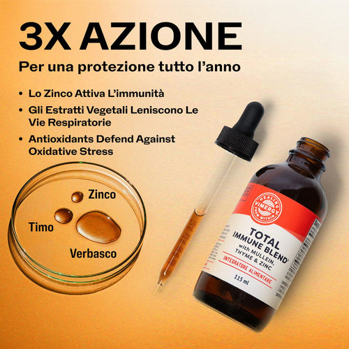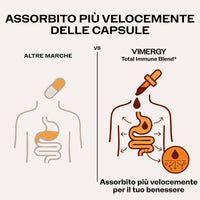 Ogni stagione è la stagione delle difese immunitarie. Vimergy Total Immune BlendTM fornisce una difesa immunitaria dinamica durante tutto l'anno, non solo nei mesi invernali! Contiene solfato di zinco liquido, una forma clinicamente studiata per essere 2 volte più biodisponibile delle compresse standard di solfato di zinco.