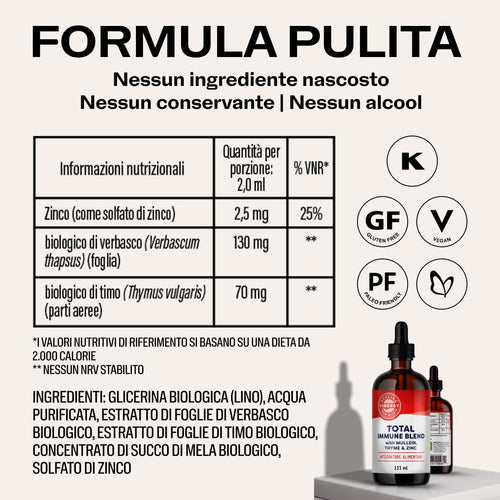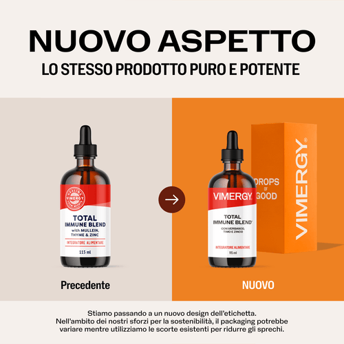 Vimergy Total Immune BlendTM combina erbe collaudate come Verbasco e Timo con un potente zinco liquido per fornire una difesa immunitaria antiossidante tutto l'anno.