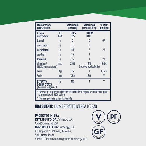 Il succo di erba d'orzo è prodotto da succo di erba d'orzo concentrato 21 volte rispetto all'erba d'orzo, il che lo rende una fonte altamente biodisponibile di nutrienti funzionali.